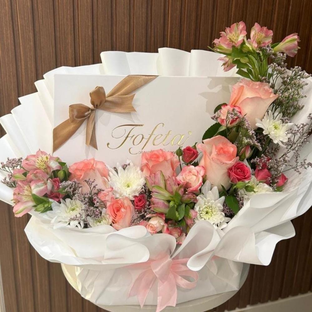 باقة ورد طبيعي فيها علبة شكولاته